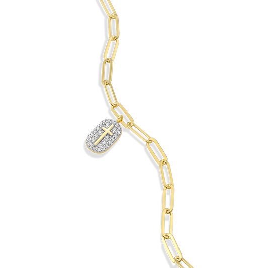 This elegant paperclip bracelet features a cross pendant adorned with lab-created diamonds. For a timeless design, it is crafted in 14K gold and rhodium-plated sterling silver.